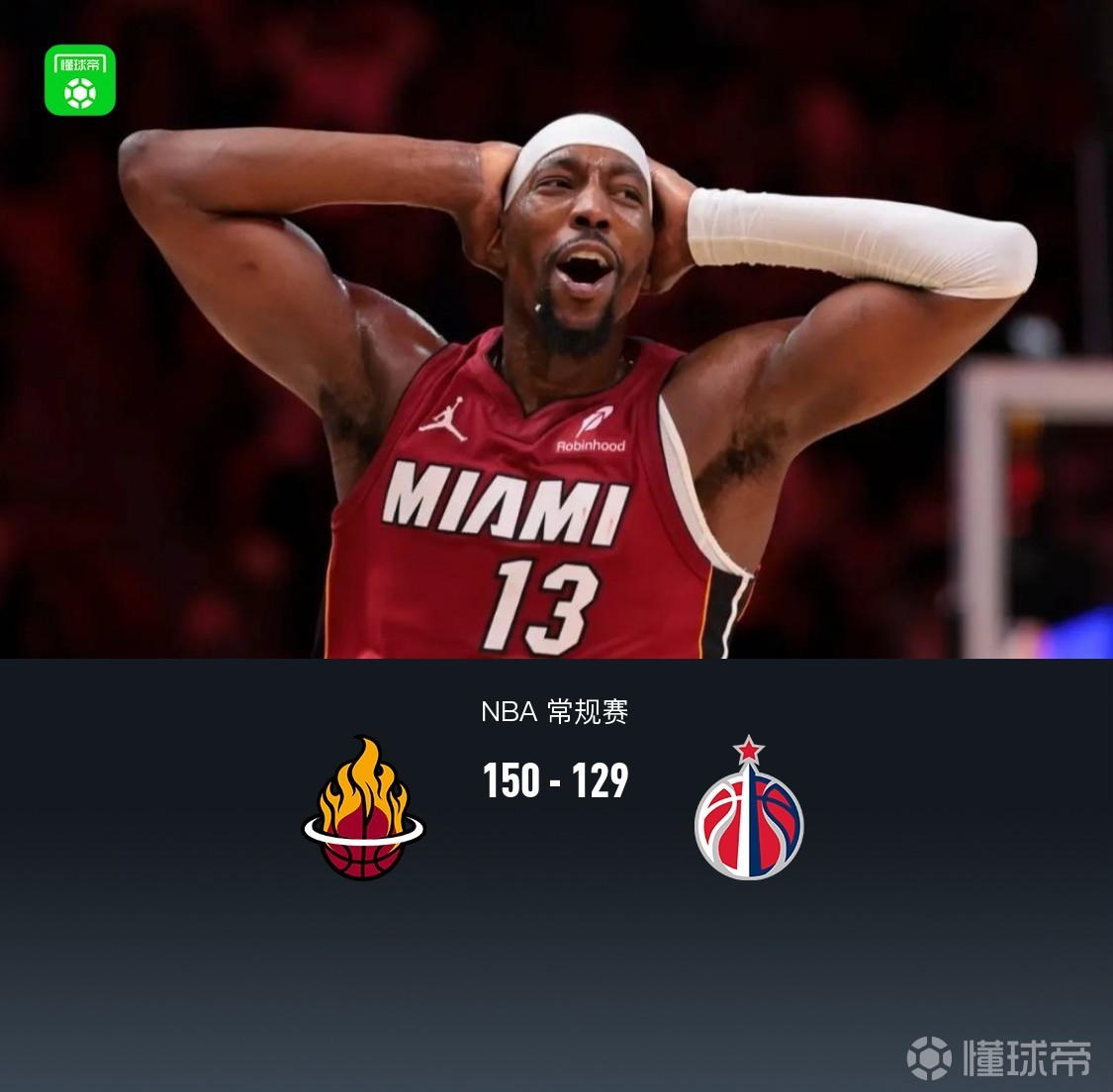 第四节热火阿德巴约拿下21分,奇才杰登-哈迪拿下9分,最终热火150-129战胜奇才