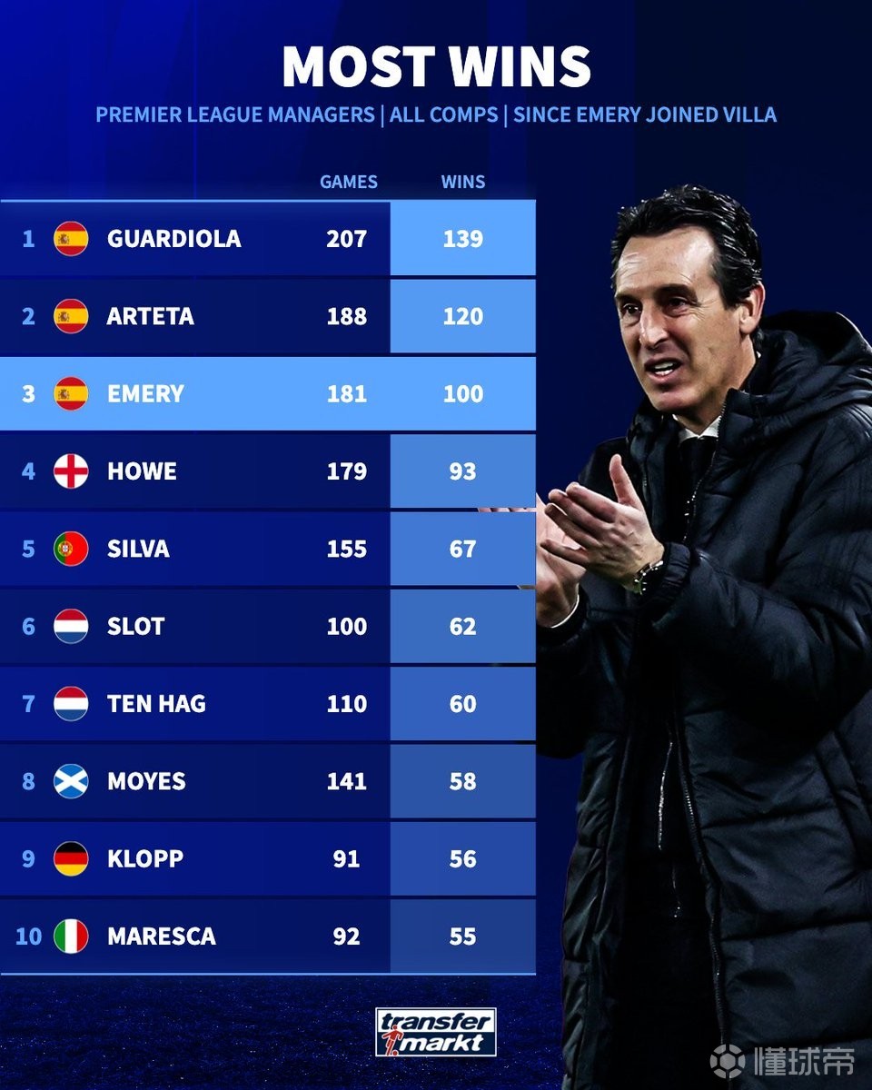 赛后根据德转的统计,本场比赛的胜利是埃梅里自2022年11月接手维拉以来,率队出战181场正式比赛所拿到的第100场胜利,同期在英超俱乐部的主教练中,只有瓜迪奥拉和阿尔特塔率队拿到的胜场比他更多。